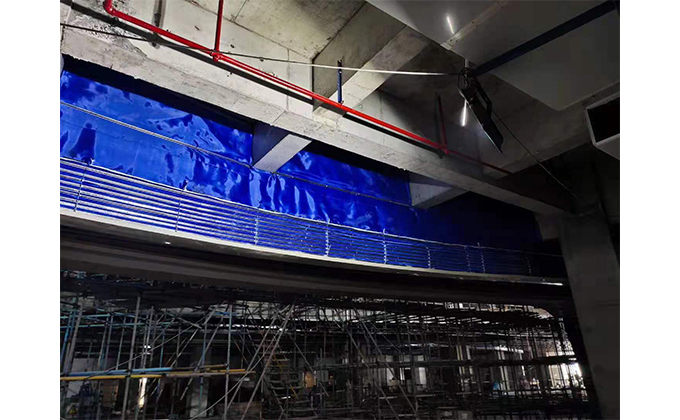 擋煙垂簾垂壁根據(jù)設(shè)計要求和現(xiàn)場實(shí)際情況采取如下施工順序:首先,搭設(shè)腳手架一放線一打眼--上脹栓一焊骨架。第二,吊件一安裝骨架…